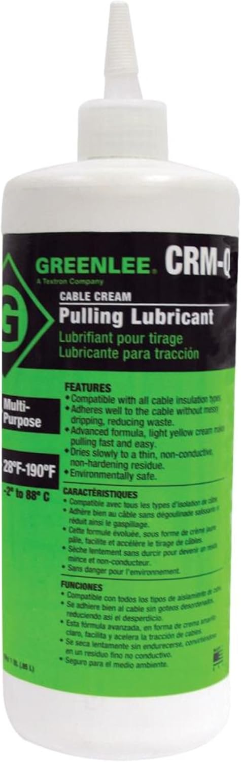 The Greenlee CRM-Q is a professional-grade cable pulling lubricant designed to reduce friction and simplify wire installation in conduits. Its light yellow, non-conductive formula adheres to cables without messy dripping, drying to a thin, non-hardening residue. Compatible with all insulation types, this environmentally safe lube performs in extreme temperatures and cleans up easily.