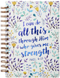 This inspiring spiral-bound journal features the empowering verse "I can do all this through Him who gives me strength" in elegant purple foil. With its cheerful calico design of yellow flowers and teal/purple leaves on a white background, this journal provides 192 lined pages - each featuring Scripture verses at the bottom for daily encouragement. The 1-inch brass wire binding allows for lay-flat writing, making it perfect for prayers, notes, or journaling.