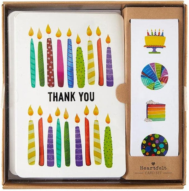 Express your gratitude in style with this 12-count boxed set of thank you cards, designed specifically for birthday occasions. Each white cardstock card features a vibrant design of brightly colored lit candles and comes with matching stickers to add a personal touch. The blank interiors allow you to craft heartfelt messages for friends and family who made your birthday special.