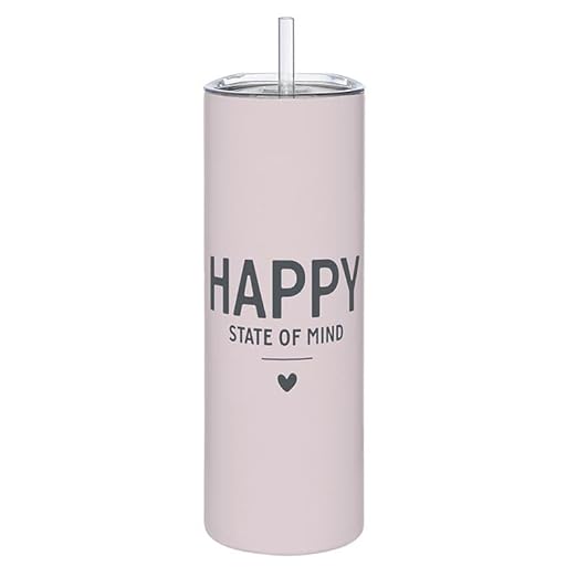 Sip in style with this 20oz stainless steel skinny tumbler featuring an uplifting "Happy State of Mind" message in sleek dark grey print with a heart accent. The light pink tumbler keeps drinks hot or cold for hours with its double-wall insulation, while the included BPA-free lid and straw make it perfect for on-the-go hydration.