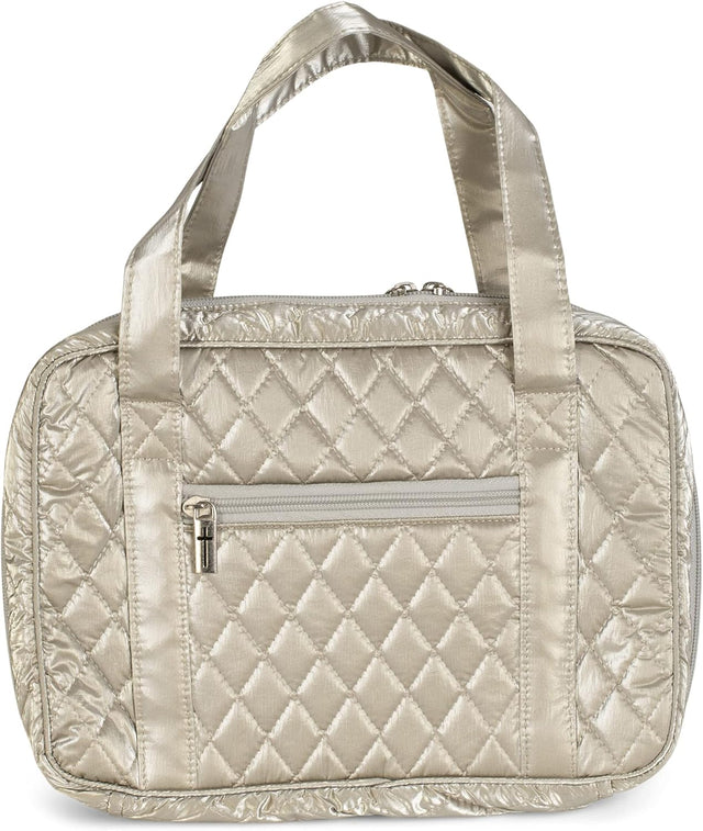 Protect and carry your large print Bible in style with this elegant faux leather purse-style case featuring a sophisticated champagne quilted design. The double zipper closure keeps your Bible secure while allowing it to lay flat for reading, and the exterior zip pocket provides convenient storage for small essentials. With dual purse handles, built-in ribbon bookmark, and pen holder, this case combines functionality with beautiful craftsmanship.