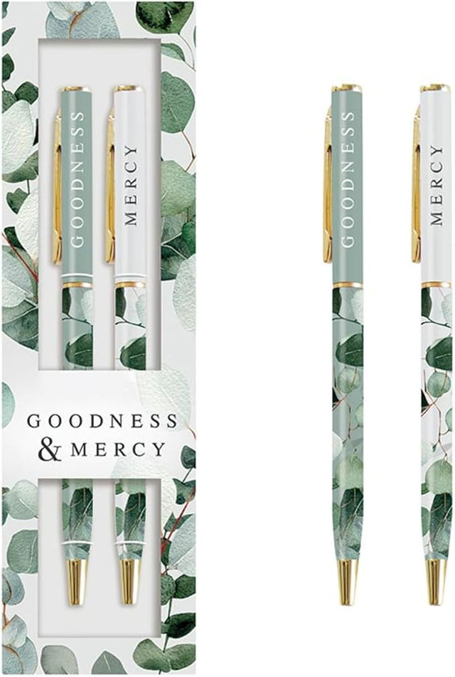 Encourage yourself or a loved one daily with this elegant set of 2 retractable ballpoint pens featuring uplifting Scripture-inspired designs. Each metal barrel pen displays the words "Goodness" and "Mercy" alongside the comforting verse *"He restores my soul - Psalm 23:3"*, all set against a soothing green foliage background.