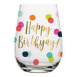 Celebrate in style with this charming 20oz stemless wine glass featuring a playful polka dot pattern and festive "Happy Birthday" design. Perfect for birthday toasts and celebrations, this glass combines whimsical charm with practical functionality for all your favorite beverages.
